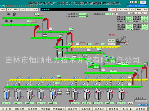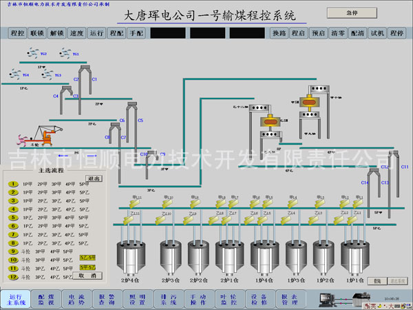 输煤程控包括上煤程控、配煤程控和上位机,监控控制的对象包括:给煤机、三通挡板、皮带机、碎煤机、除铁器、犁式卸煤器等设备。主要完成手自动上煤,手自动配煤,分炉计量,自动振打,皮带保护等功能。系统采用可编程控制器和上位机组成冗余控制网络,简单可靠,能充分满足输煤工艺和设备运行要求。