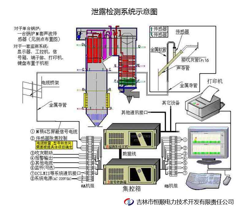 由吉林市恒顺电力技术开发有限责任公司研发的SFJ型锅炉承压管泄漏监测报警系统在第二代锅炉炉管检漏装置技术的基础上,将一系列目前先进的信号分析、数据处理、数字放大与滤波、数据库、网络等技术以及泄漏诊断涉及到的实验研究、理论分析结果和大量实践经验融为一体,极大的提高了监测的准确性和灵敏度,实现了锅炉承压管泄漏的早期报警和泄漏过程的可视化。SFJ型锅炉承压管泄漏监测报警系统主要由声波传导管、传感器、阻抗匹配放大器、滤波器、转换器、主机、数据采集卡、FFT分析、报警装置、输出装置等构成。